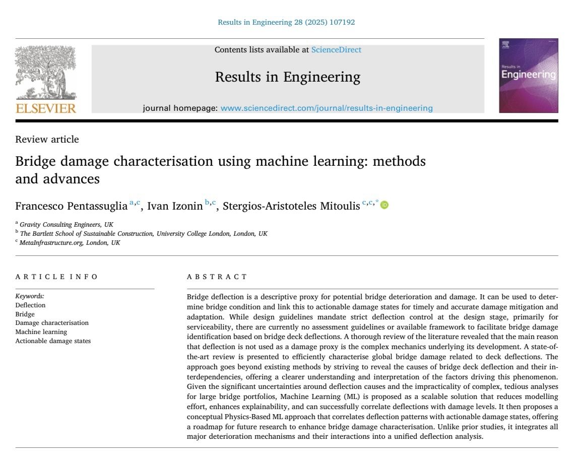 A new review article co-authored by Professor Stergios-Aristoteles Mitoulis (University College London, Bartlett School of Sustainable Construction), Francesco Pentassuglia, and Dr.Ivan Izonin, has been published in Results in Engineering (Elsevier).