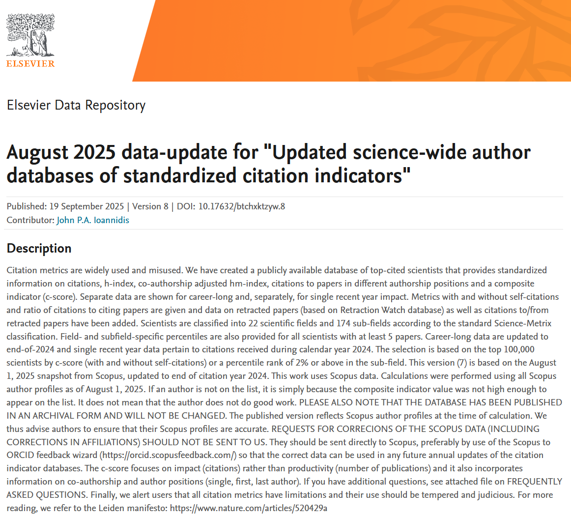 For the 4th consecutive year, three of MetaInfrastructure members have been recognised in the Stanford–Elsevier list of the world’s top-cited scientists (version 8, based on Scopus data up to the end of 2024).
