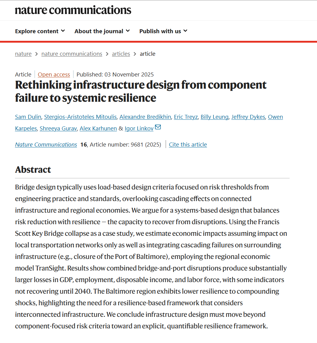Using the Francis Scott Key Bridge collapse (Baltimore) as a case study and the “TranSight” regional economic model, the paper shows that combined bridge-and-port failures generate substantially larger losses in GDP, employment and income, with some indicators not recovering until 2040.